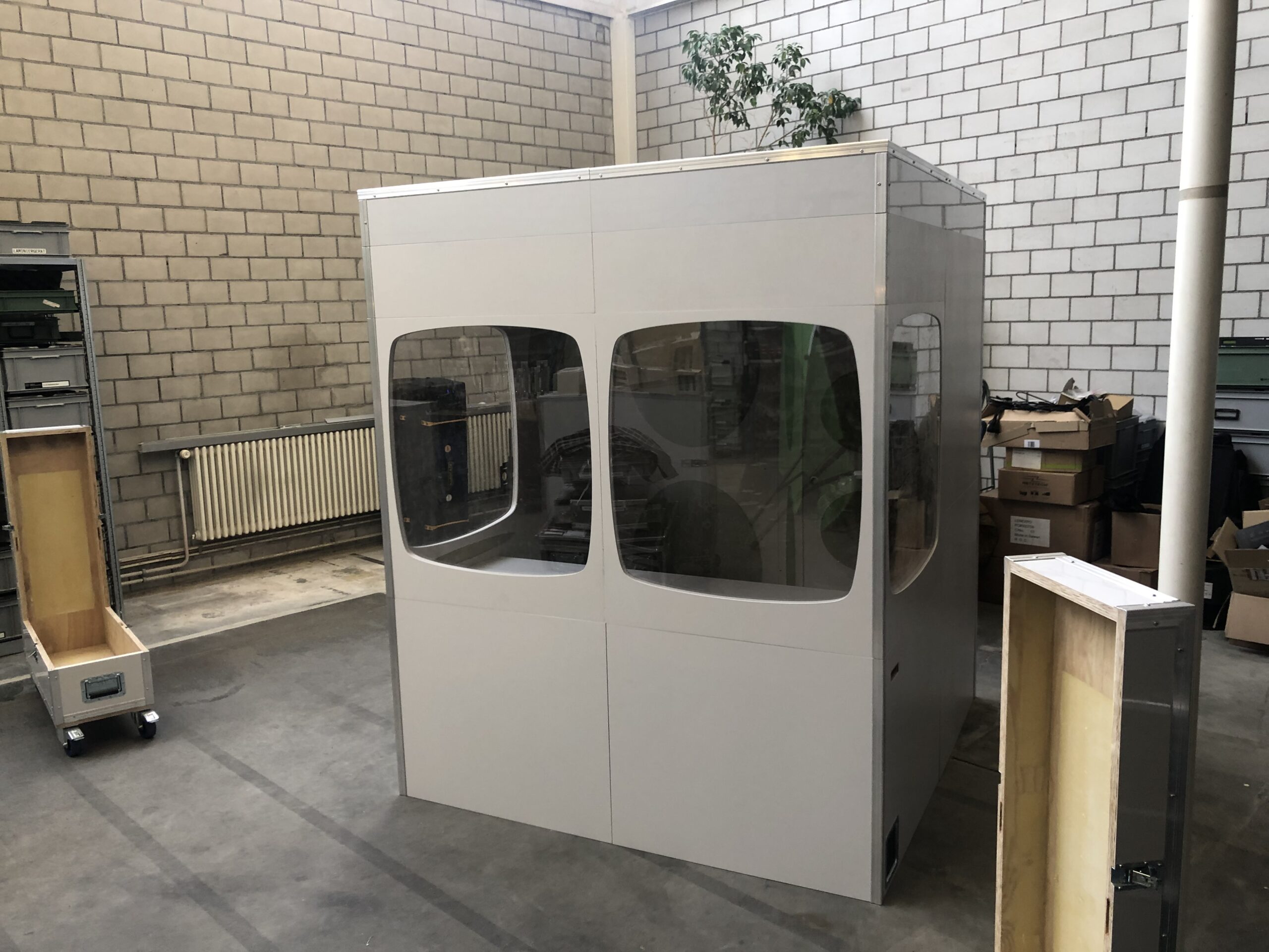 Die Kabine überzeugt durch ein ruhiges, modernes Design, das sich harmonisch in Konferenzräume, Kongresszentren oder Eventlocations integriert. Grosszügige Sichtfenster ermöglichen eine klare Sicht auf Bühne, Präsentationen oder Publikum und unterstützen so die präzise Arbeit der Dolmetscher.